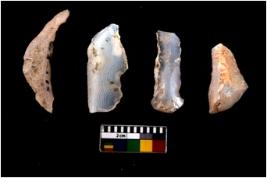 | Description / विवरण | Specimen of flake tools with prominent flaking marks. They are made up of a short flakes with sides trimmed. |