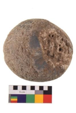 | Description / विवरण | Specimen of a roughly round shaped hammerstone with battered periphery along with the circumference. It is blackish in colour. |