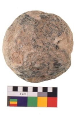 | Description / विवरण | Specimen of an uneven shaped hammerstone with battered periphery along with the circumference. It is blackish and creamish in colour. |