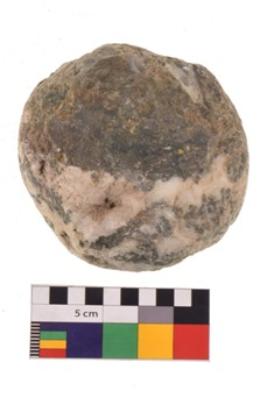 | Description / विवरण | Specimen of a roughly round shaped hammerstone with battered periphery along with the circumference. It is blackish in colour. |