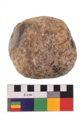 | Description / विवरण | Specimen of a roughly round shaped hammerstone with battered periphery along with the circumference. It is brownish in colour. |