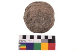 | Description / विवरण | Specimen of a round shaped hammerstone with battered periphery along with the circumference. It is blackish in colour. |