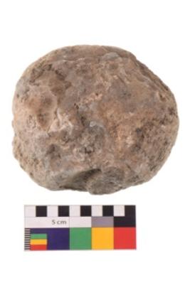 | Description / विवरण | Specimen of an uneven shaped hammerstone with smooth surface. It is creamish in colour and has flat base. |