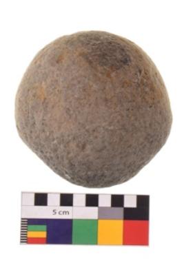 | Description / विवरण | Specimen of a roughly round shaped sling ball with rough surface. It is brownish in colour. |