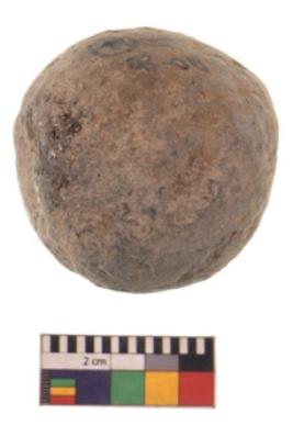 | Description / विवरण | Specimen of a roughly round shaped sling ball with rough surface. It is blackish in colour. |