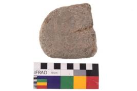 | Description / विवरण | Specimen of an uneven shaped grinding stone with smooth surface. It is blackish in colour and has flat base. |