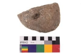 | Description / विवरण | Specimen of an uneven shaped grinding stone with smooth surface. It is brownish in colour and has flat base. |