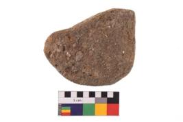 | Description / विवरण | Specimen of an uneven shaped grinding stone with smooth surface. It is brownish in colour and has flat base. |