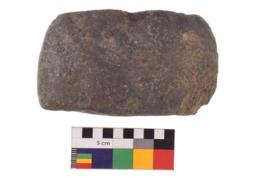 | Description / विवरण | Specimen of a square shaped grinding stone with smooth surface. It is blackish in colour and has flat base. |