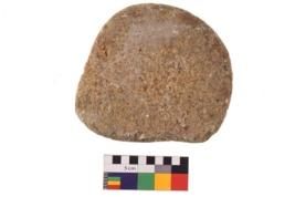 | Description / विवरण | Specimen of a roughly round shaped grinding stone with smooth surface. It is brownish in colour and has flat base. |