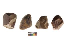 | Description / विवरण | There are n 4 utilized flakes. There are multi directional irregular scar pattern on both dorsal and ventral face of the flakes. three are tapering at one end and one has sharp edge. |