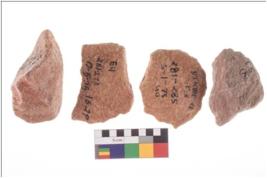 | Description / विवरण | Specimen of flake tools with prominent flaking marks. They are made up of a short flakes with sides trimmed. |