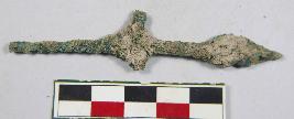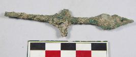 | Description / विवरण | A pointed arrow head having barbs on the mid section with rough surface. It is fully corroded. |
