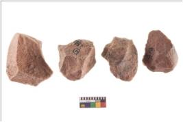 | Description / विवरण | There are n 4 utilized flake cores. There are multidirectional irregular scar pattern on both dorsal and ventral face of the flake cores. One has sharp edges and three have blunted edges. |