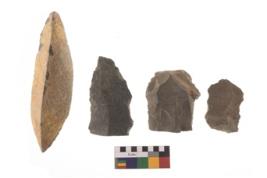 | Description / विवरण | There are n 4 flakes tool; there are large flakes with sides trimmed, Marks of secondary flaking are present on the both the faces. The dorsal is relatively flat. One is pointed functional top. |