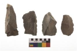 | Description / विवरण | There are n 4 flakes tool; there are large flakes with sides trimmed, Marks of secondary flaking are present on the both the faces. The dorsal is relatively flat. One is pointed functional top. |