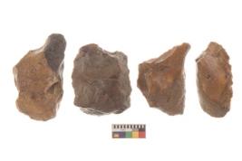 | Description / विवरण | There are n 4 utilized flakes. There are multi directional irregular scar pattern on both dorsal and ventral face of the flakes. Three have tapering at one end and one has sharp edge. |