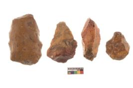 | Description / विवरण | There are n 4 utilized flakes. There are multi directional irregular scar pattern on both dorsal and ventral face of the flakes. Three have sharp edges and one has blunt edge at one end. |