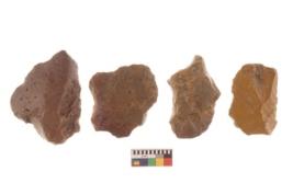 | Description / विवरण | There are n 4 utilized flakes. There are multi directional irregular scar pattern on both dorsal and ventral face of the flakes. Three have tapering at one end and one has sharp edge. |