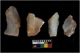 | Description / विवरण | There are n 4 utilized flake cores. There are multi directional irregular scar pattern on them. One has sharp edge and three are tapering at one end. |