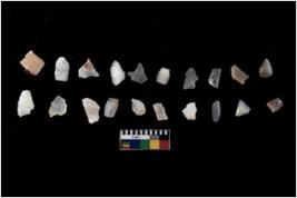 | Description / विवरण | Specimen of flakes tool with prominent flaking marks. It made up of a short flakes with sides trimmed. |