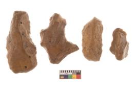 | Description / विवरण | There are n 4 utilized flakes. There are multi directional irregular scar pattern on both dorsal and ventral face of the flakes. Three have sharp edges at one end and one has blunt edge. |