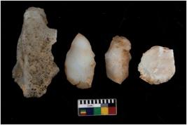 | Description / विवरण | There are n 4 utilized flake cores. There are multi directional irregular scar pattern on them. One has sharp edge and three are tapering at one end. |