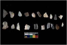 | Description / विवरण | Specimen of flakes tool with prominent flaking marks. It made up of a short flakes with sides trimmed. |