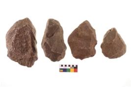 | Description / विवरण | here are n 4 utilized Chopper chopping tool and core. There are multi directional irregular scar pattern on both dorsal and ventral face of the Chopping. Three have tapering edges and one has sharp edge at one end. |