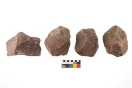 | Description / विवरण | here are n 4 utilized Chopper chopping tool and core. There are multi directional irregular scar pattern on both dorsal and ventral face of the Chopping. Three have round edges and one has sharp edge at one end. |