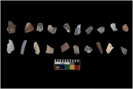 | Description / विवरण | Specimen of flakes tool with prominent flaking marks. It made up of a short flakes with sides trimmed. |