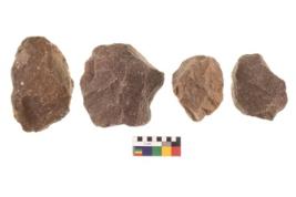 | Description / विवरण | here are n 4 utilized Chopper chopping tool and core. There are multi directional irregular scar pattern on both dorsal and ventral face of the Chopping. Three have sharp edges and one has blunt edge at one end. |