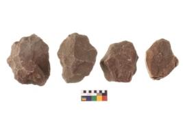 | Description / विवरण | here are n 4 utilized Chopper chopping tool and core. There are multi directional irregular scar pattern on both dorsal and ventral face of the Chopping. Two have tapering edges and two have sharp edge at one end. |