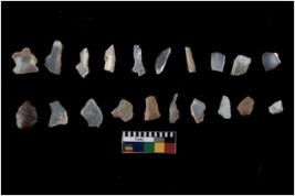 | Description / विवरण | Specimen of flakes tool with prominent flaking marks. It made up of a short flakes with sides trimmed. |