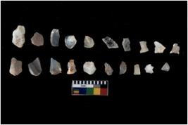 | Description / विवरण | Specimen of flakes tool with prominent flaking marks. It made up of a short flakes with sides trimmed. |