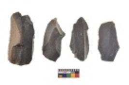 | Description / विवरण | There are n 4 utilized flake cores. There are multi directional irregular scar pattern on both dorsal and ventral face of the flake cores. All of them are tapering at one end. |