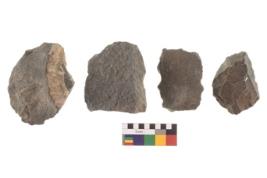 | Description / विवरण | There are n 4 utilized flakes. There are multi directional irregular scar pattern on both dorsal and ventral face of the flakes. Three have tapering at one end and one has blunted edge. |
