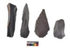| Description / विवरण | There are n 4 utilized flake cores. There are multi directional irregular scar pattern on both dorsal and ventral face of the flake cores. All of them are tapering at one end. |