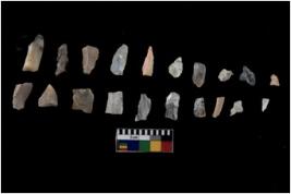 | Description / विवरण | Specimen of flakes tool with prominent flaking marks. It made up of a short flakes with sides trimmed. |