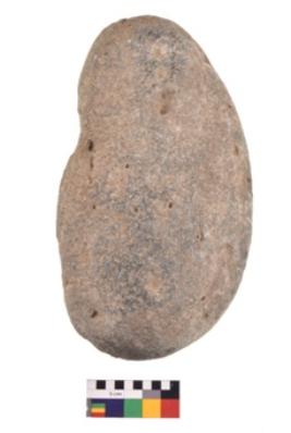 | Description / विवरण | Specimen of a roughly oval shaped saddle quern. It is blackish in colour and smooth in texture. It is round in cross section. |