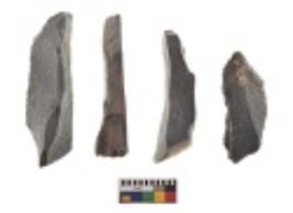 | Description / विवरण | There are n 4 utilized flake cores. There are multi directional irregular scar pattern on both dorsal and ventral face of the flake cores. All of them are tapering at one end. |