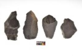 | Description / विवरण | There are n 4 utilized flake cores. There are multi directional irregular scar pattern on both dorsal and ventral face of the flake cores. Two are tapering at one end and two have blunted edges. |