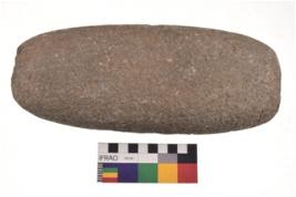 | Description / विवरण | Specimen of a roughly rectangular shaped saddle quern. It is blackish in colour and smooth in texture. It has flat base. |