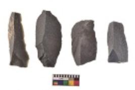 | Description / विवरण | There are n 4 utilized flake cores. There are multi directional irregular scar pattern on both dorsal and ventral face of the flake cores. All of them are tapering at one end. |