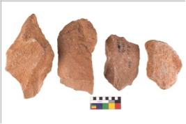| Description / विवरण | There are n 4 utilized flake cores. There are multidirectional irregular scar pattern on both dorsal and ventral face of the flake cores. One has sharp edges and three have blunted edges. |