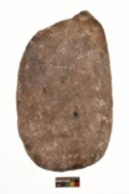 | Description / विवरण | Specimen of a roughly oval shaped saddle quern. It is brownish in colour and coarse in texture. It has flat base. |