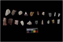 | Description / विवरण | Specimen of flakes tool with prominent flaking marks. It made up of a short flakes with sides trimmed. |