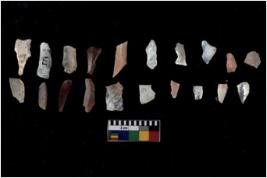 | Description / विवरण | Specimen of flakes tool with prominent flaking marks. It made up of a short flakes with sides trimmed. |