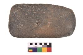 | Description / विवरण | Specimen of a roughly rectangular shaped saddle quern. It is blackish in colour and smooth in texture. It has flat base. |