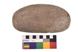 | Description / विवरण | Specimen of a roughly oval shaped saddle quern with smooth surface. It is brownish in colour and round in cross section. |